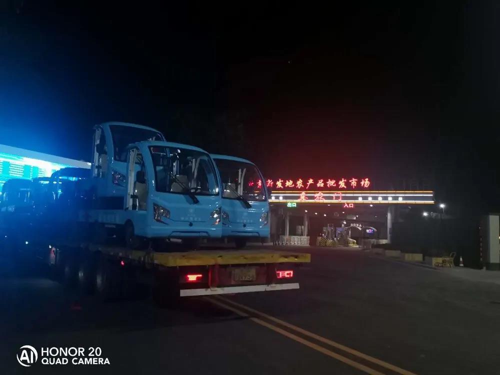 2020年8月15日早7:38,伴隨著瓜果蔬菜的芬芳,久違的新發(fā)地批發(fā)市場正式復市。隨之正式上崗的還有20輛綠友電動貨斗車。