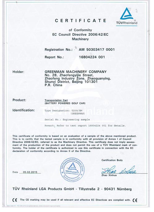 近日,由綠友集團自主研發(fā)的GREENMAN兩座電瓶車golf car通過了CE認證。