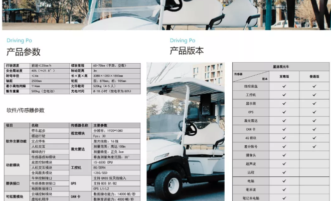 Driving Po星途智能網(wǎng)聯(lián)接待車是一款安全可靠的低速智能網(wǎng)聯(lián)車產(chǎn)品,可在園區(qū)等半封閉道路完成各種無人駕駛、智能網(wǎng)聯(lián)駕駛功能,高度還原無人駕駛、智能網(wǎng)聯(lián)乘用車傳感器方案,100%自主開發(fā),車輛支持硬擴(kuò)展和軟件二次開發(fā)。