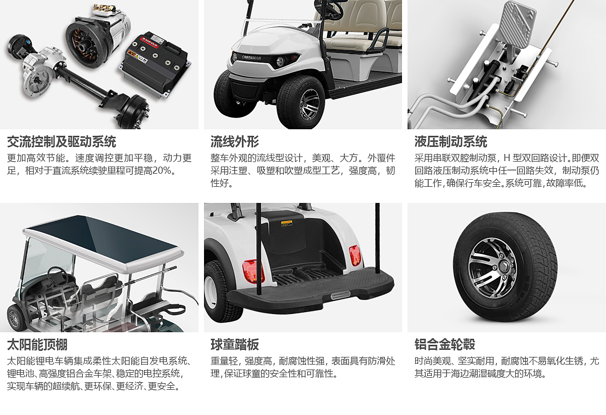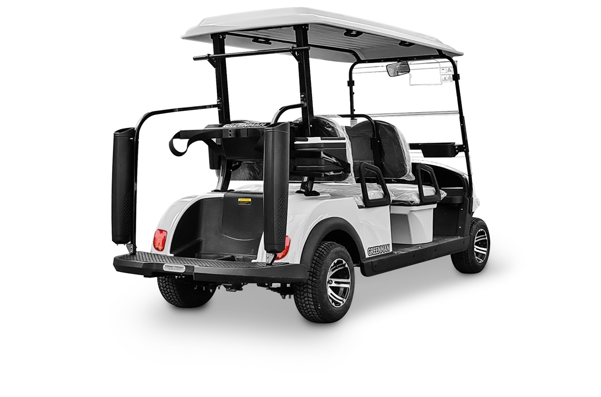 同向四座高爾夫球車,可以供4名球手和2名球童同時駕乘,也可以供3名球手和3名球童同時駕乘。 本車秉承GREENMAN 電動車一貫的優雅、高端的理念,造型美觀大方。